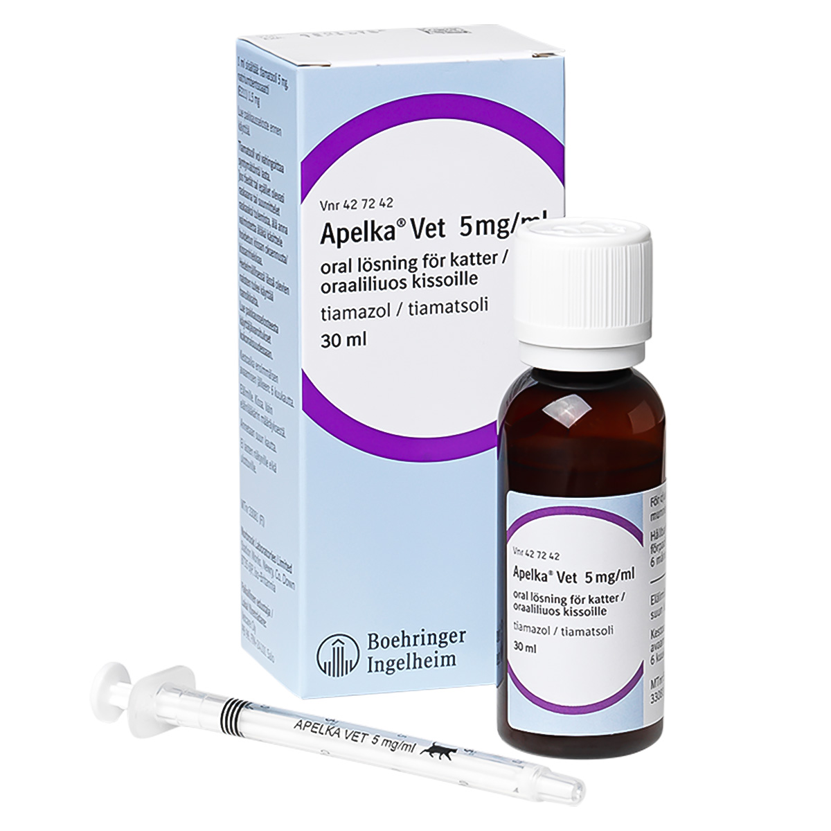 Apelka / Апелка 30 мл – ветеринарное средство для лечения гипертиреоза у кошек и собак, у животных с проблемами щитовидной железы после проведения диагностических исследований. Препарат продаётся в форме раствора для перорального применения, возможен длительный период терапии или назначение лекарства для стабилизации состояния питомца. Активное вещество тиамазол - для кошек в начальной дозе назначается по 5 мг в сутки, соответственно необходимо отмерить 5 мл раствора Апелка на один день. Суточную дозу делят на два приёма и дают животному отдельно от пищи, чтобы не снизить эффективность действия препарата, основанного на блокировке биосинтеза гормонов щитовидки.