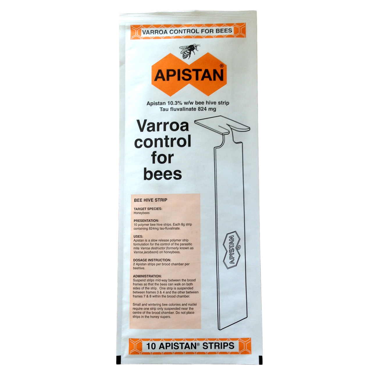 Апистан для пчёл – поливинилхлоридные полоски для защиты обитателей улья от варроатоза, вызванного гамазовым клещом, купить которые также можно для профилактики, если возникло малейшее подозрение. На одной основе из поливинилхлорида содержится 1000 мг основного действующего вещества – флувалината. В одной упаковке 10 отдельных пластин размером 3 см х 25 см, толщина каждого элемента – 2 мм. Каждая пластина размещена в надёжной таре из фольги и полиэтилена, что позволяет сохранить действие препарата в течение всего срока годности.